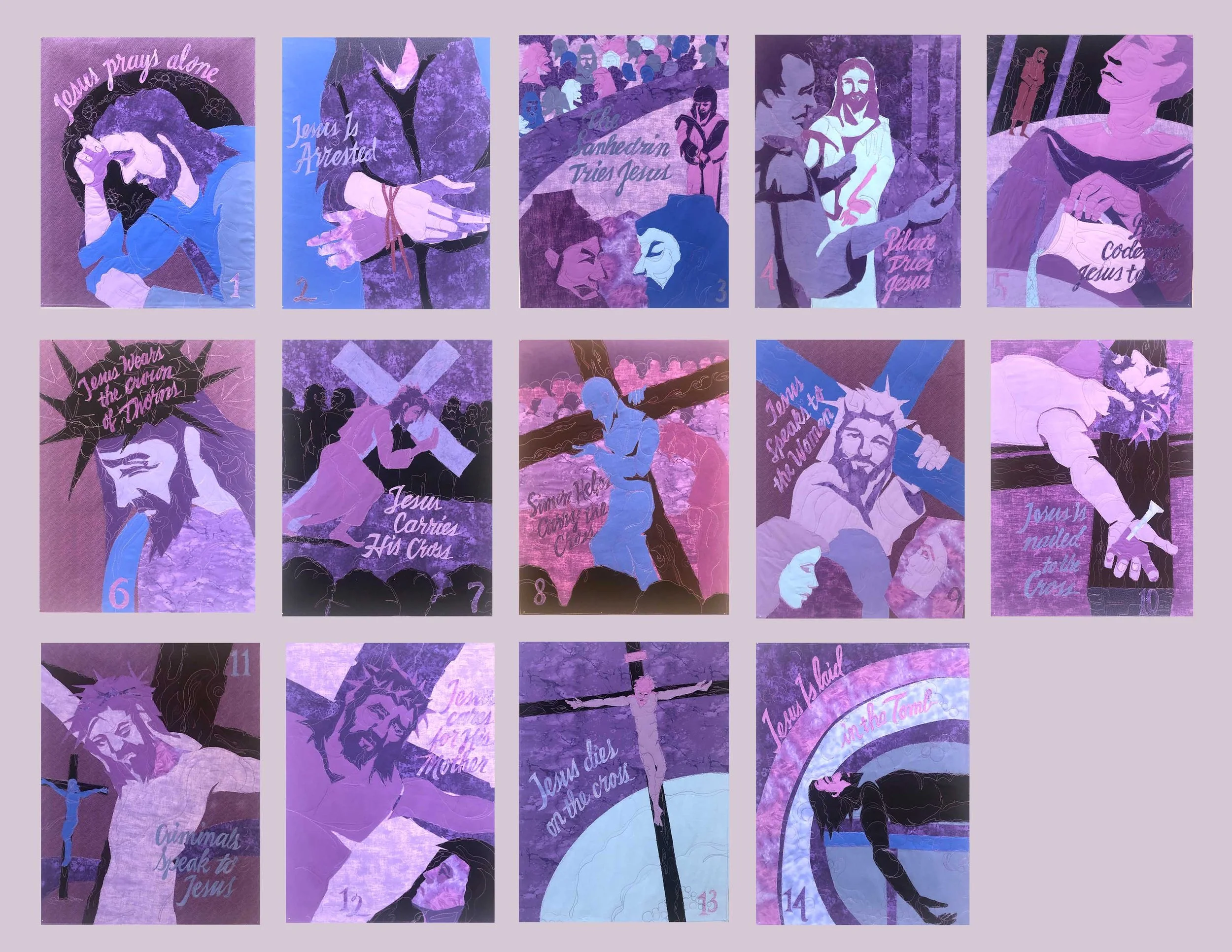 With a wide range of purples and blues, I tried to imagine unusual angles and close-up shots of the suffering Christ.